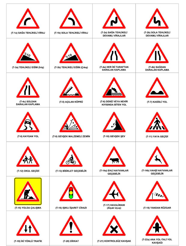 Yolda genellikle yolun durumu ile ilgili bilgi veren; dönüş, kavşak ve yol çalışması gibi bilgileri içeren trafik levhaları Tehlike uyarı işaretleri başlığının altında toplanıyor. Bu trafik levhaları T ile başlıyor.